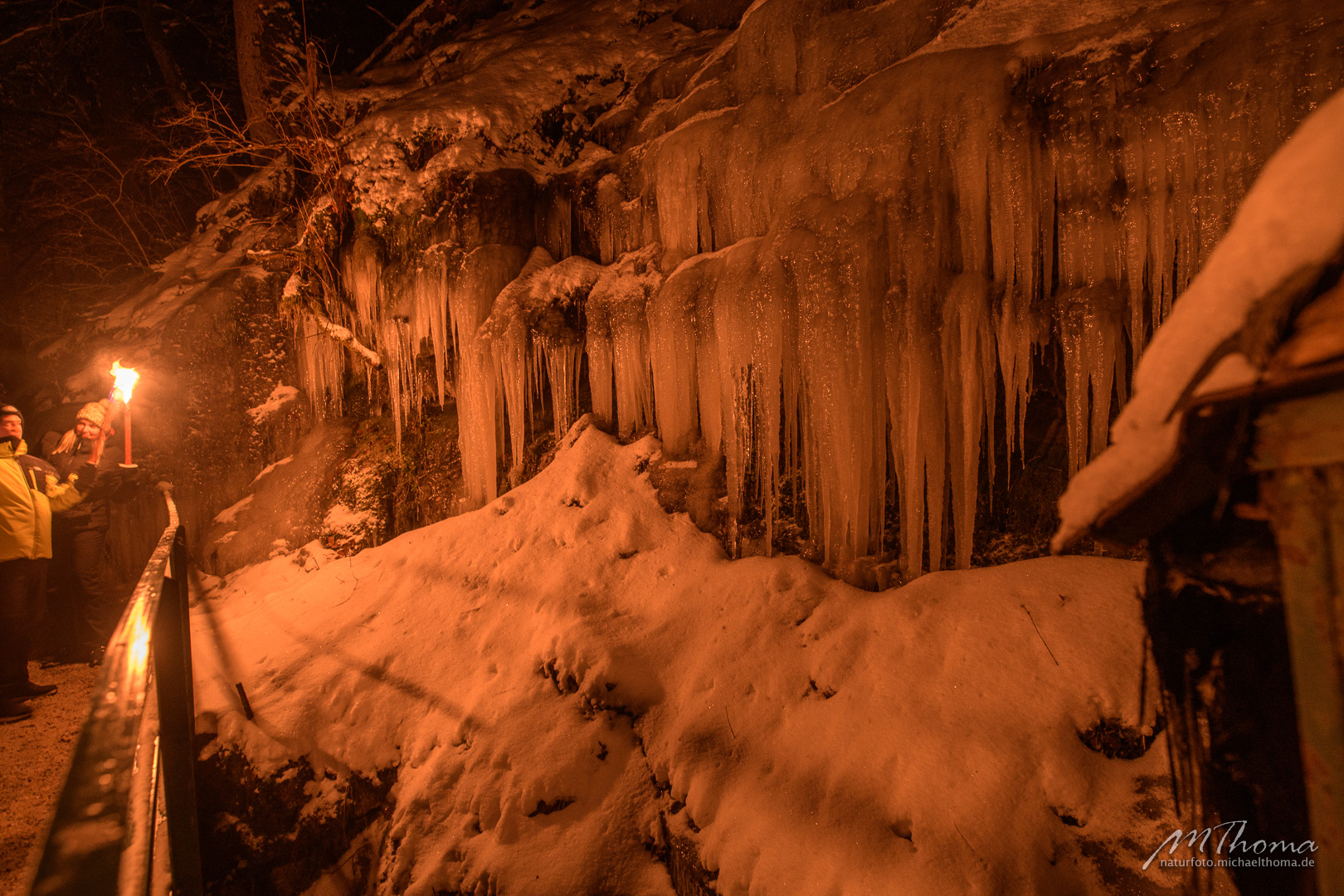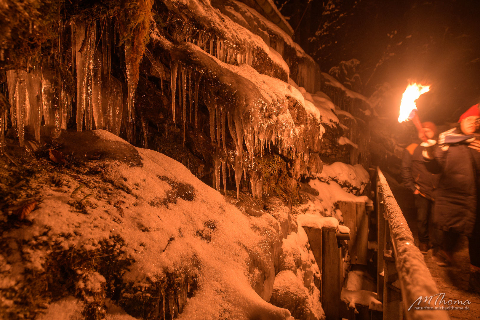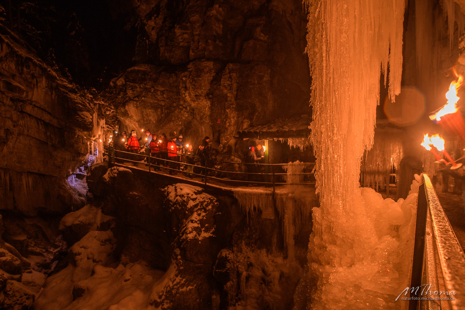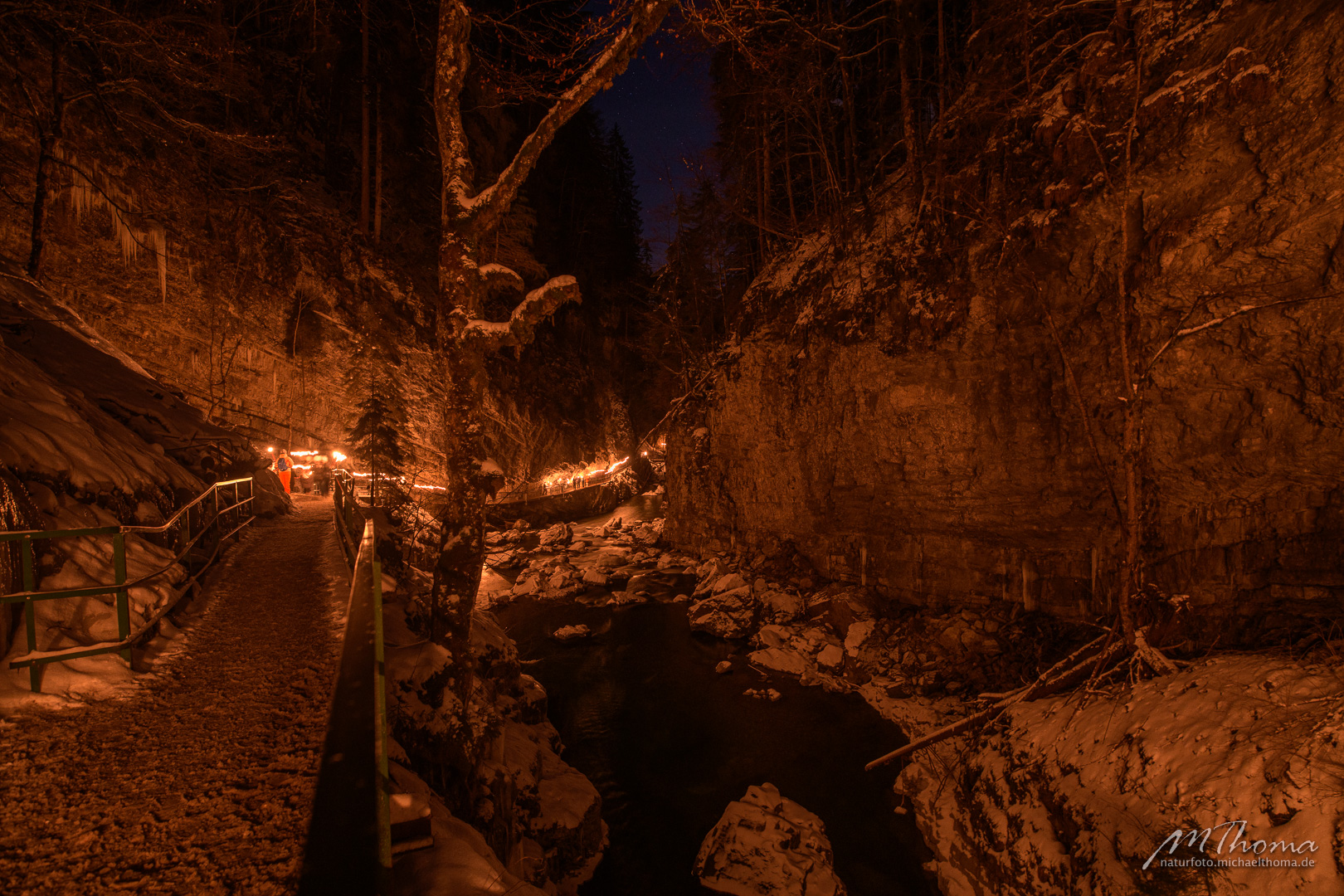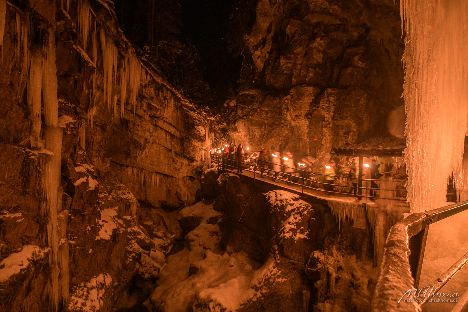 Jeden Winter fiebere ich den Fackelwanderungen in der Breitachklamm entgegen. Dieses Jahr war die Vorfreude besonders groß, weil es im letzten Jahr nicht geklappt hatte. Ich liebe einfach die besondere Atmosphäre der vereisten Klamm im Lichterschein der Fackeln